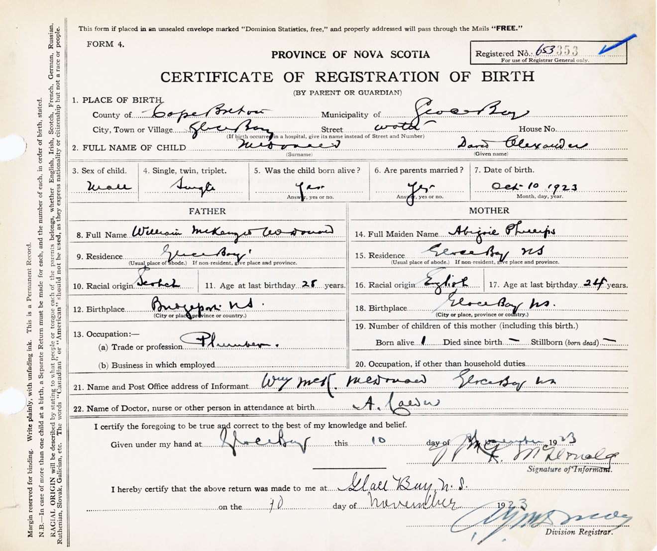 Male Birth Registration: Year: 1923 number: 65300353