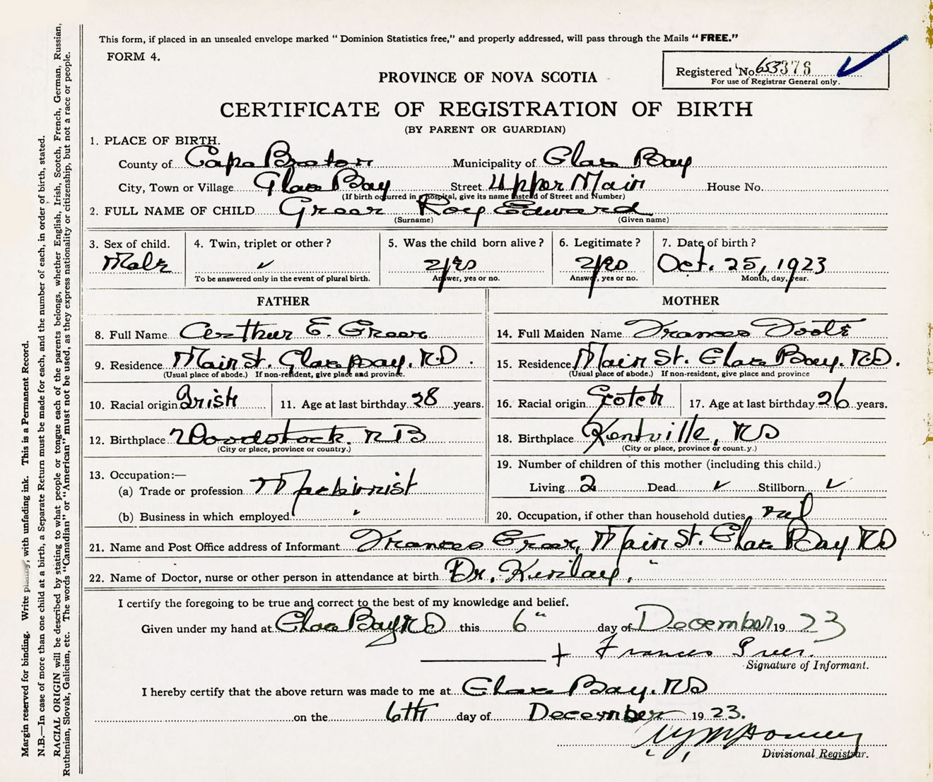 Male Birth Registration: Year: 1923 number: 65300376