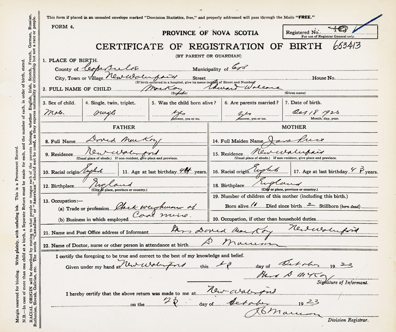 Male Birth Registration: Year: 1923 number: 65300413