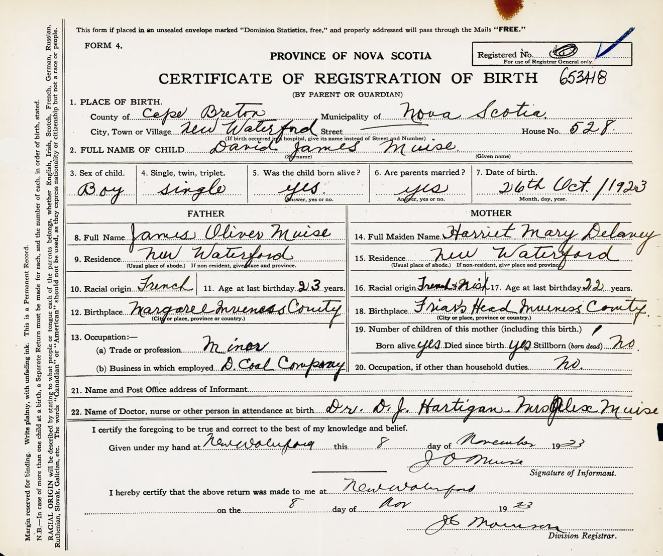 Male Birth Registration: Year: 1923 number: 65300418