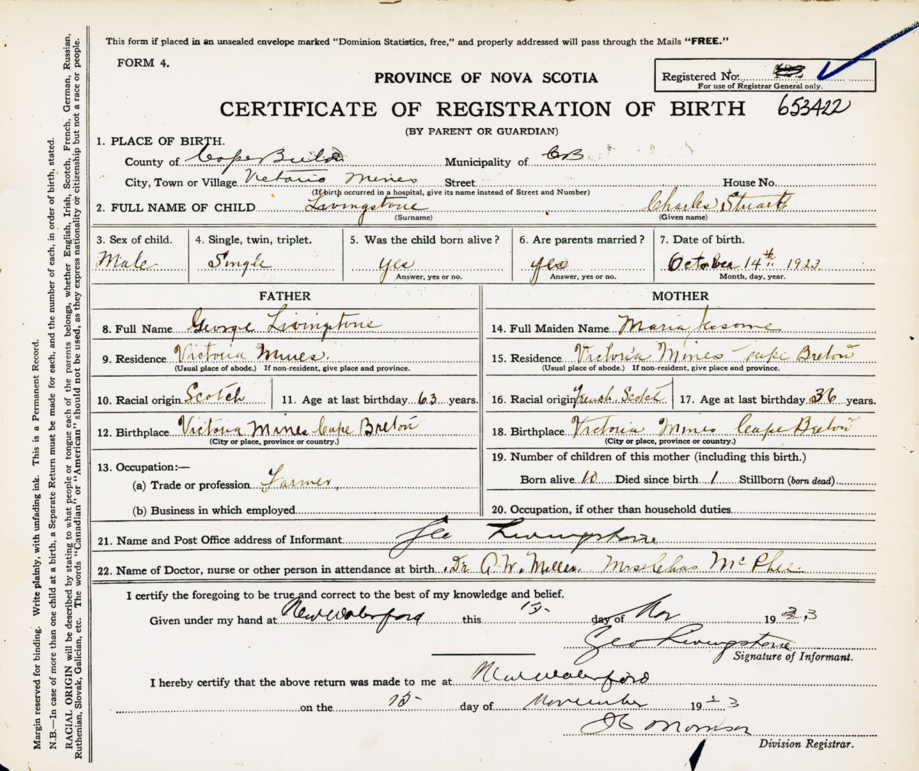Male Birth Registration: Year: 1923 number: 65300422