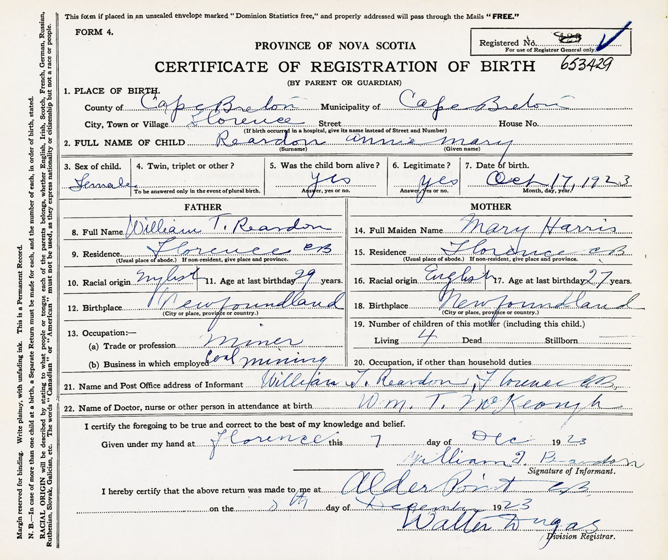 Female Birth Registration: Year: 1923 number: 65300429