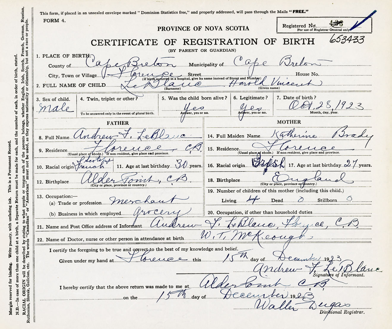 Male Birth Registration: Year: 1923 number: 65300433