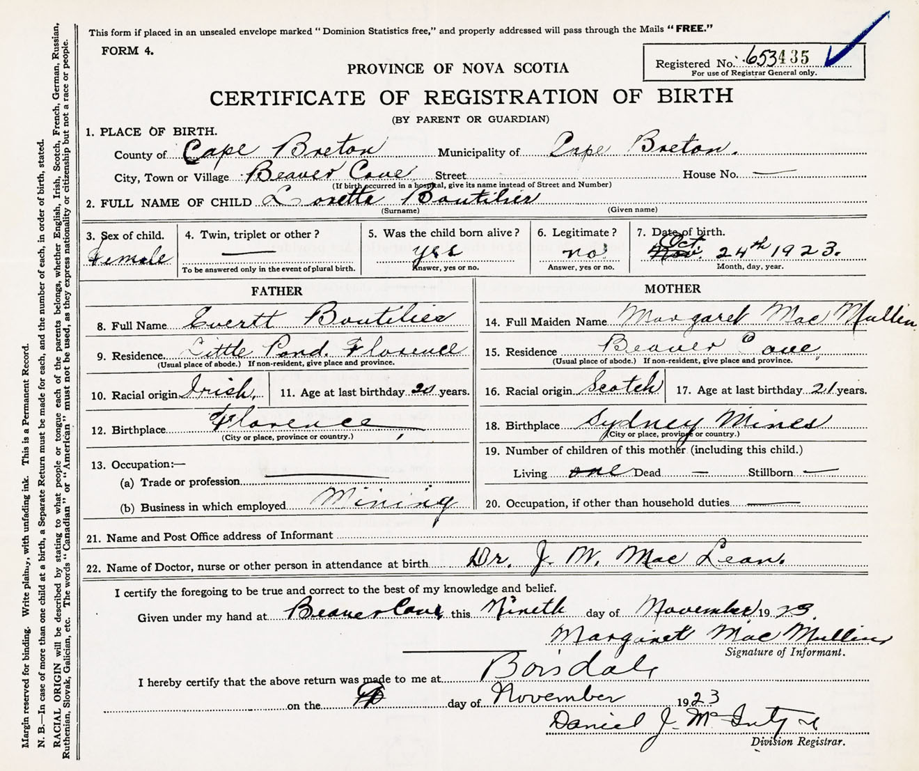 Female Birth Registration: Year: 1923 number: 65300435