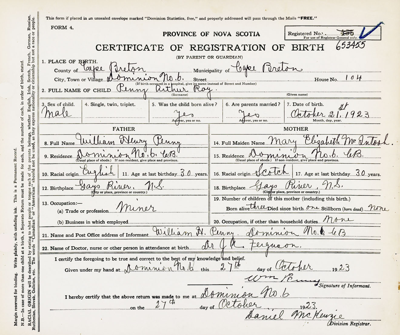 Male Birth Registration: Year: 1923 number: 65300455