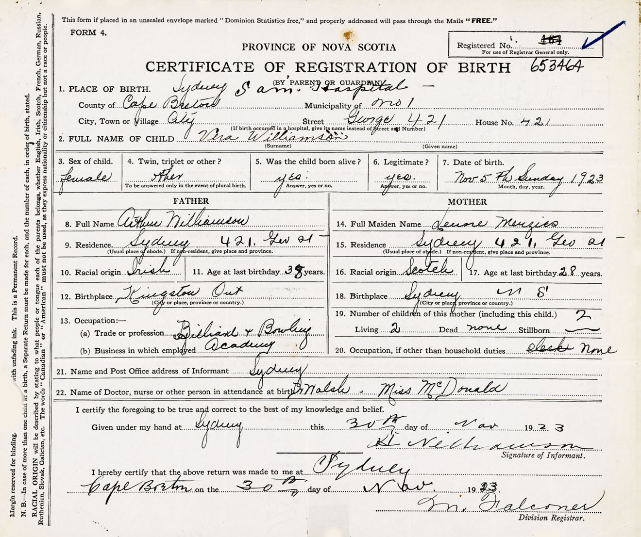 Female Birth Registration: Year: 1923 number: 65300464