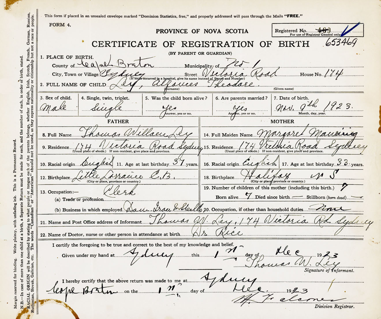 Male Birth Registration: Year: 1923 number: 65300469