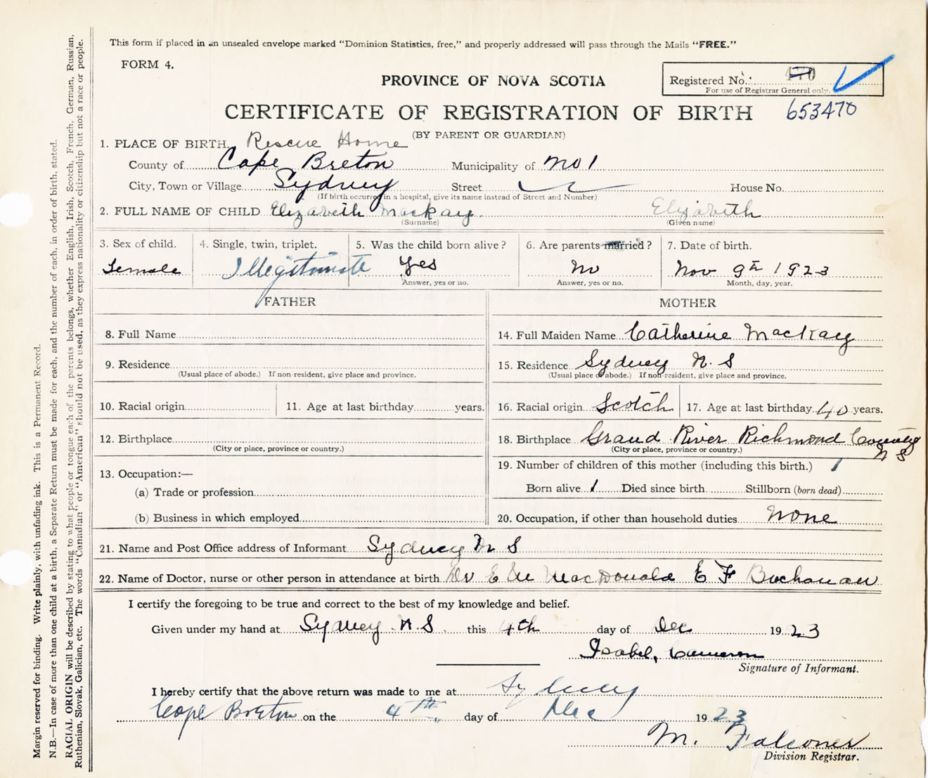 Female Birth Registration: Year: 1923 number: 65300470