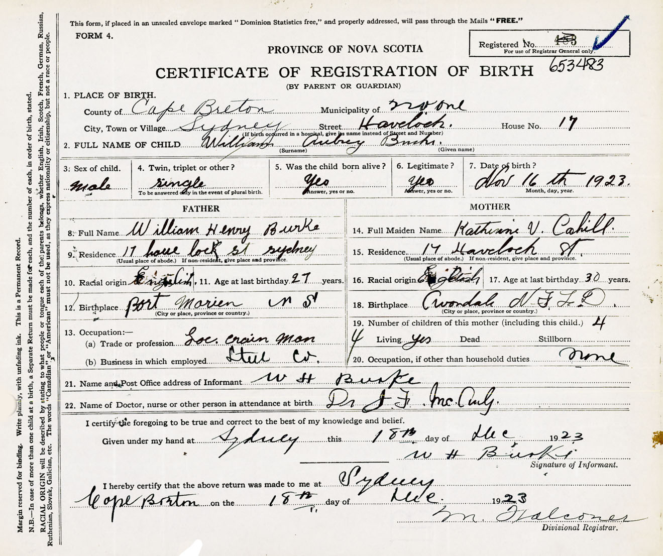 Male Birth Registration: Year: 1923 number: 65300483