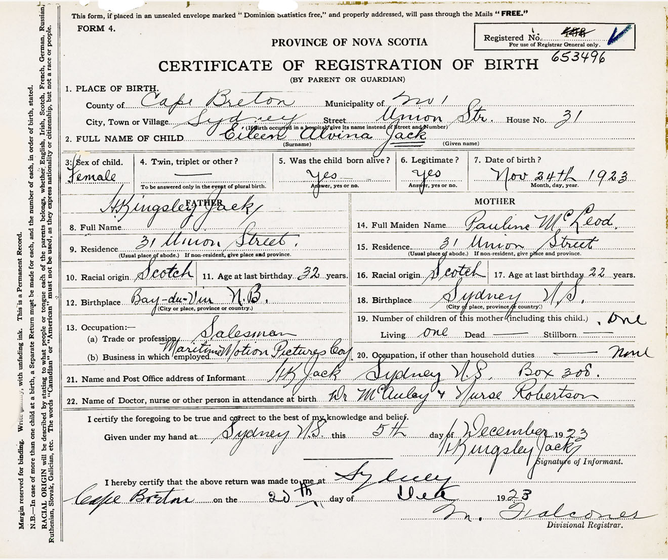 Female Birth Registration: Year: 1923 number: 65300496