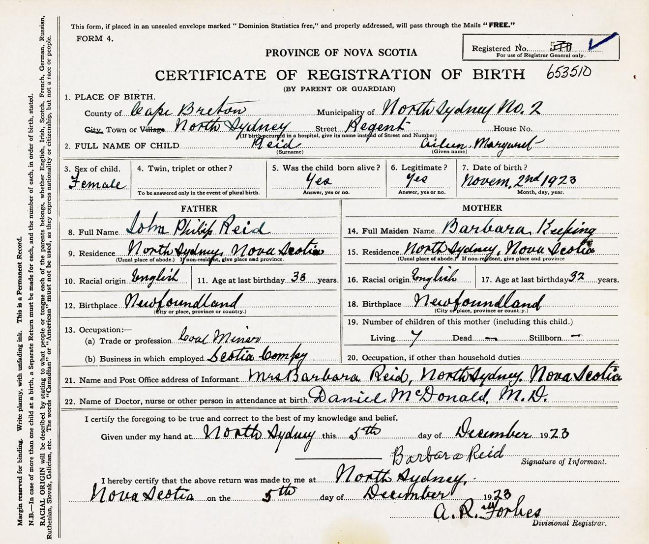 Female Birth Registration: Year: 1923 number: 65300510