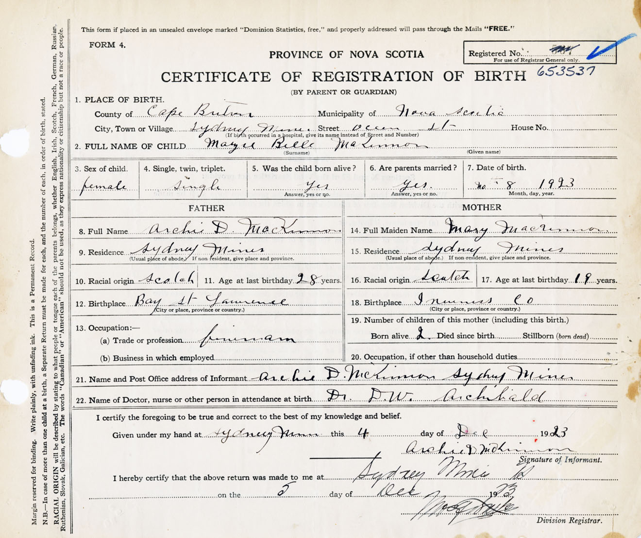 Female Birth Registration: Year: 1923 number: 65300537