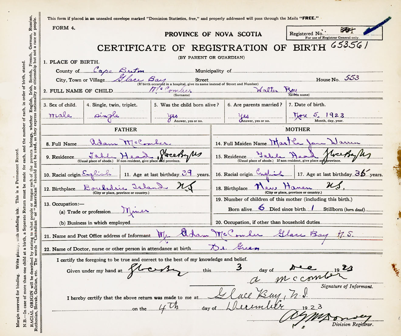 Male Birth Registration: Year: 1923 number: 65300561
