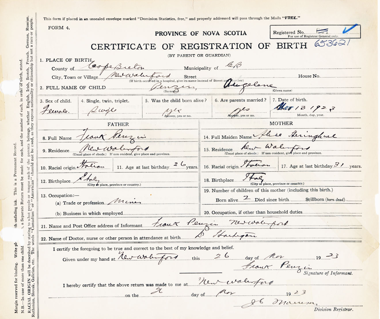 Female Birth Registration: Year: 1923 number: 65300621