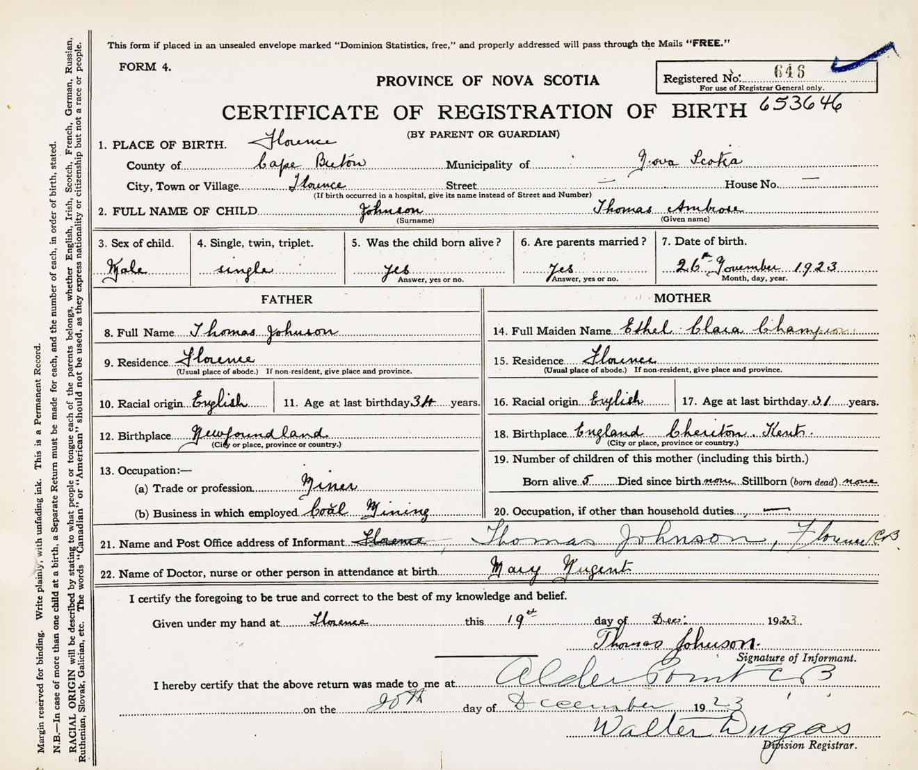 Male Birth Registration: Year: 1923 number: 65300646