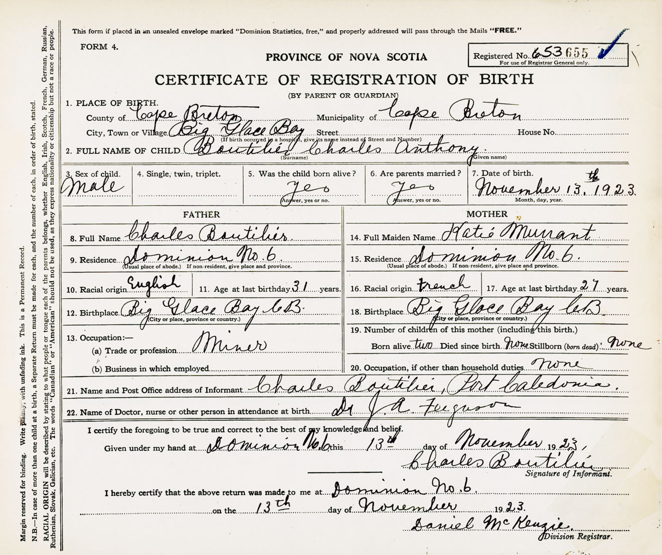 Male Birth Registration: Year: 1923 number: 65300655