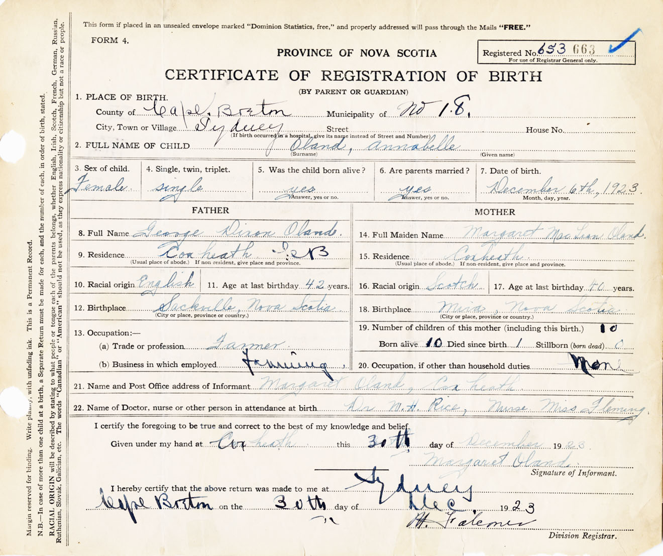 Female Birth Registration: Year: 1923 number: 65300663