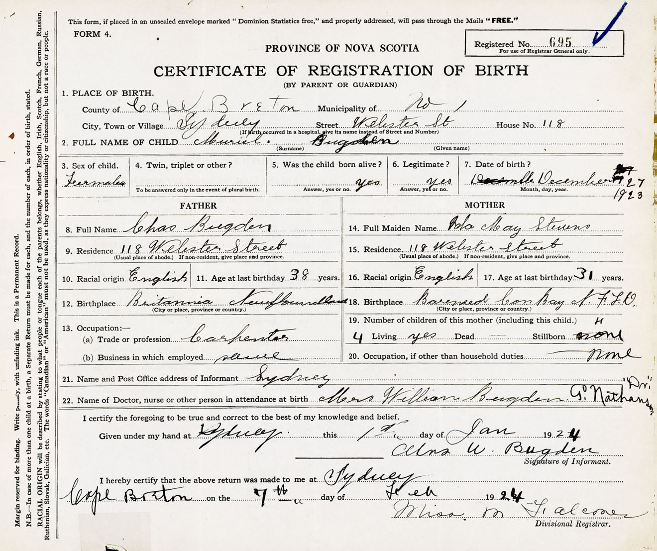 Female Birth Registration: Year: 1923 number: 65300695