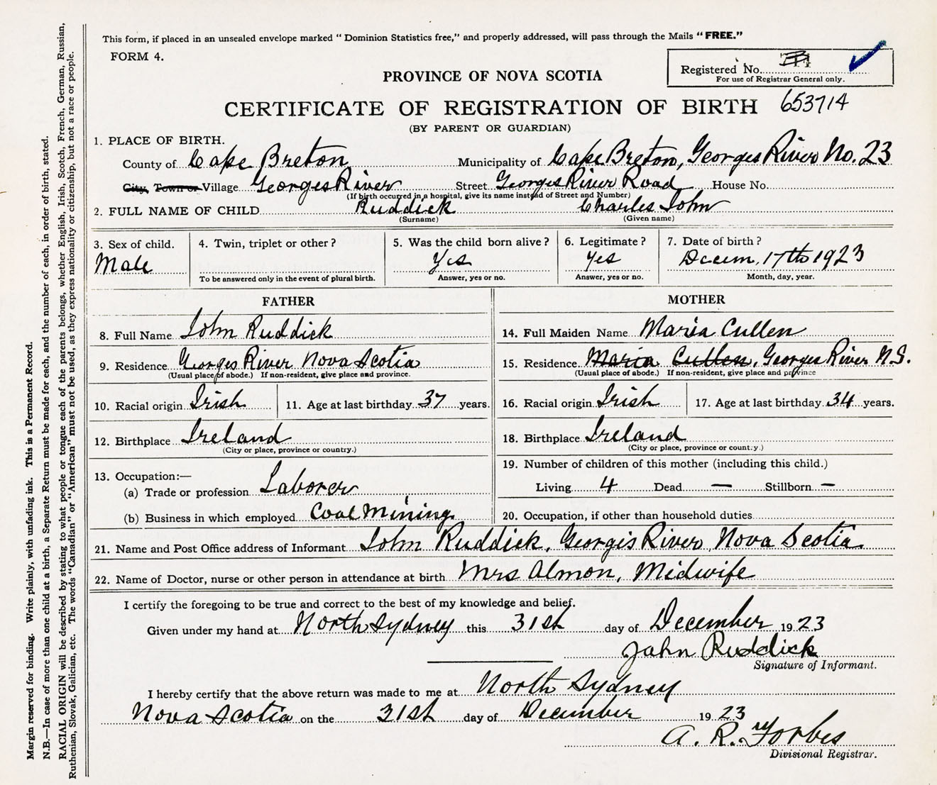 Male Birth Registration: Year: 1923 number: 65300714