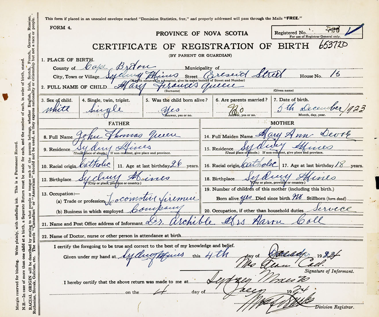 Female Birth Registration: Year: 1923 number: 65300720