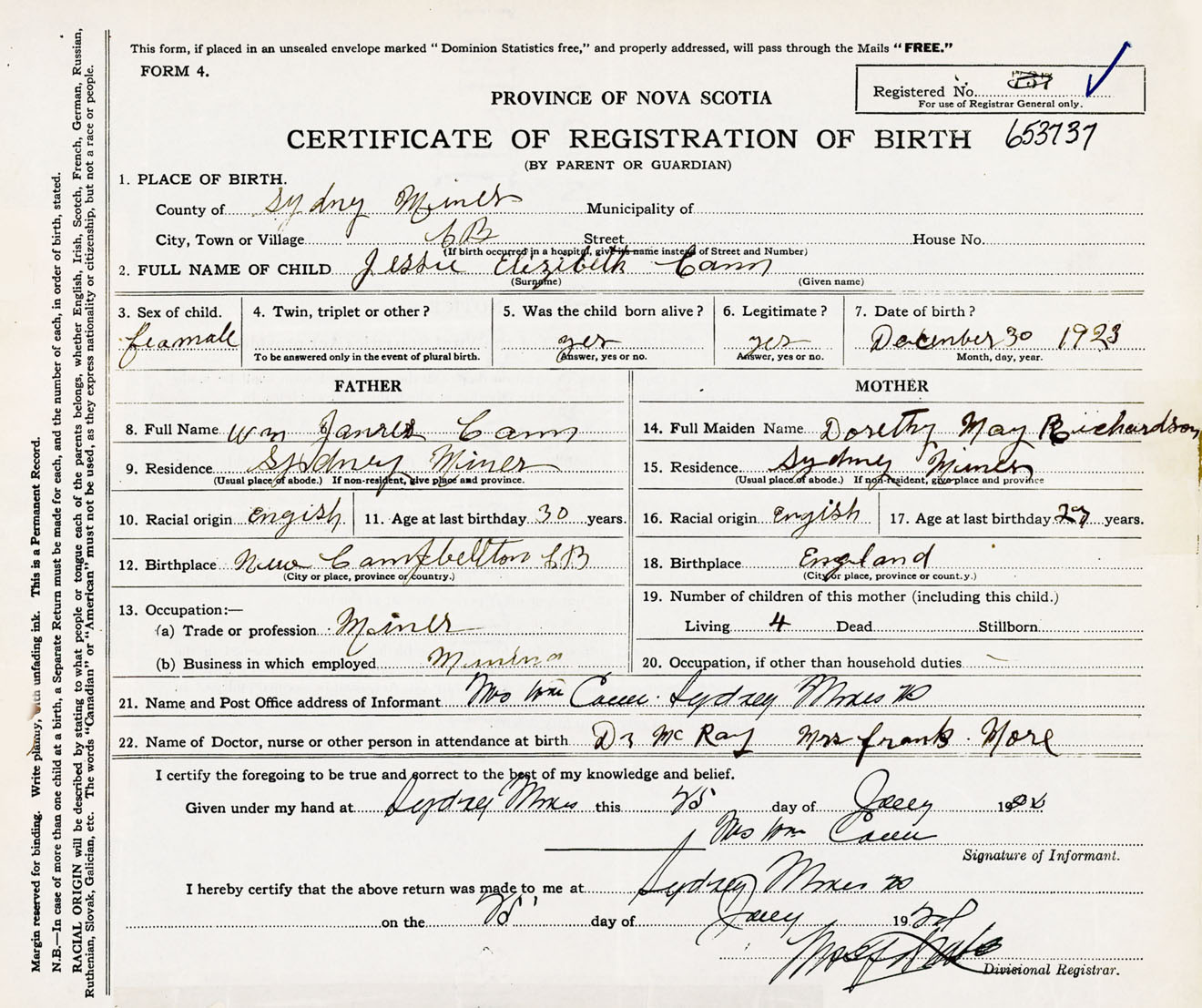 Female Birth Registration: Year: 1923 number: 65300737