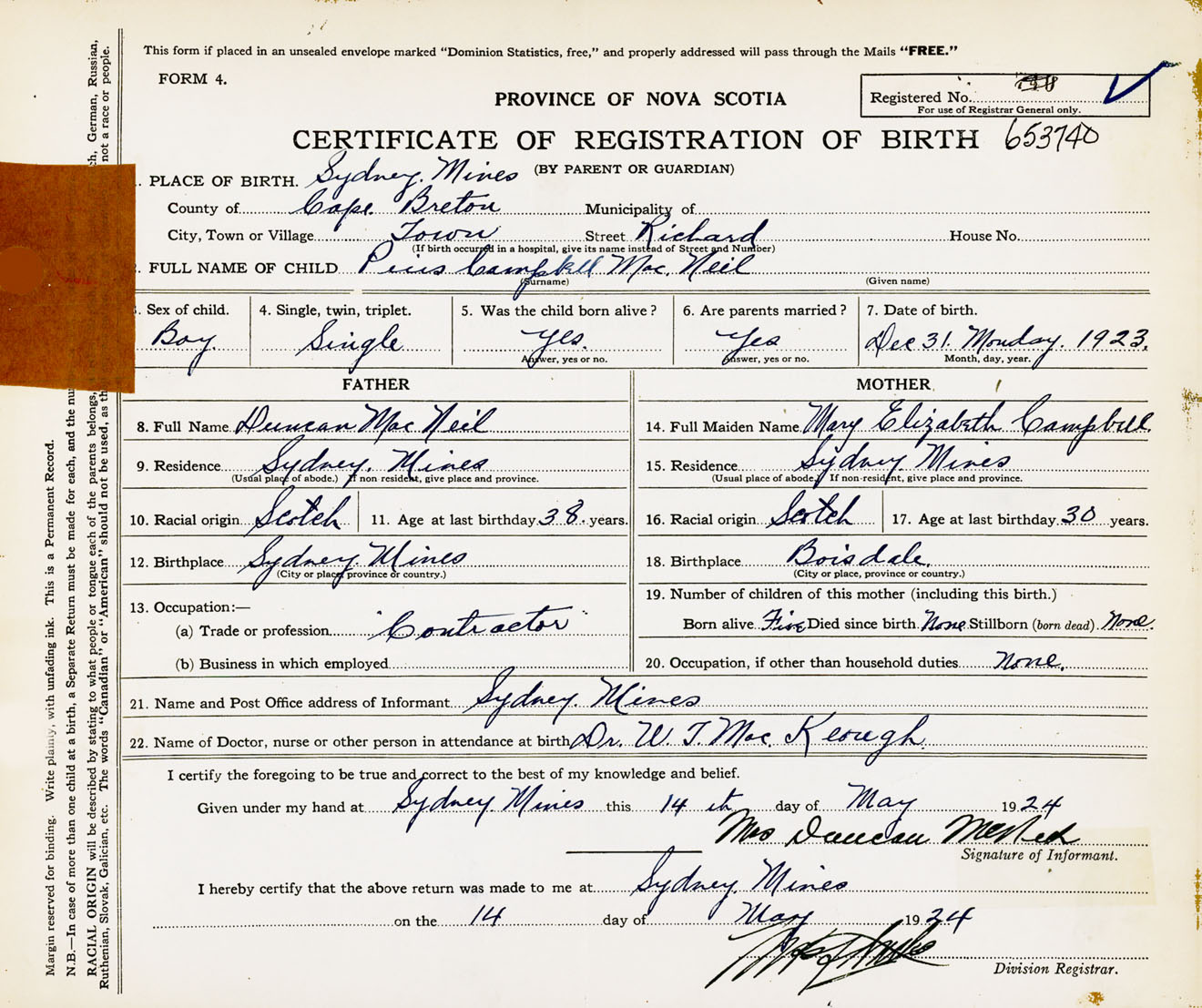 Male Birth Registration: Year: 1923 number: 65300740