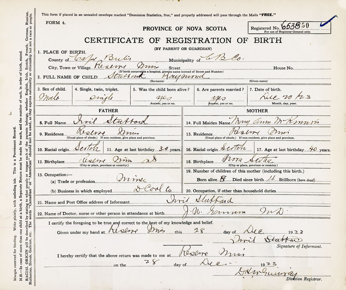 Male Birth Registration: Year: 1923 number: 65300850