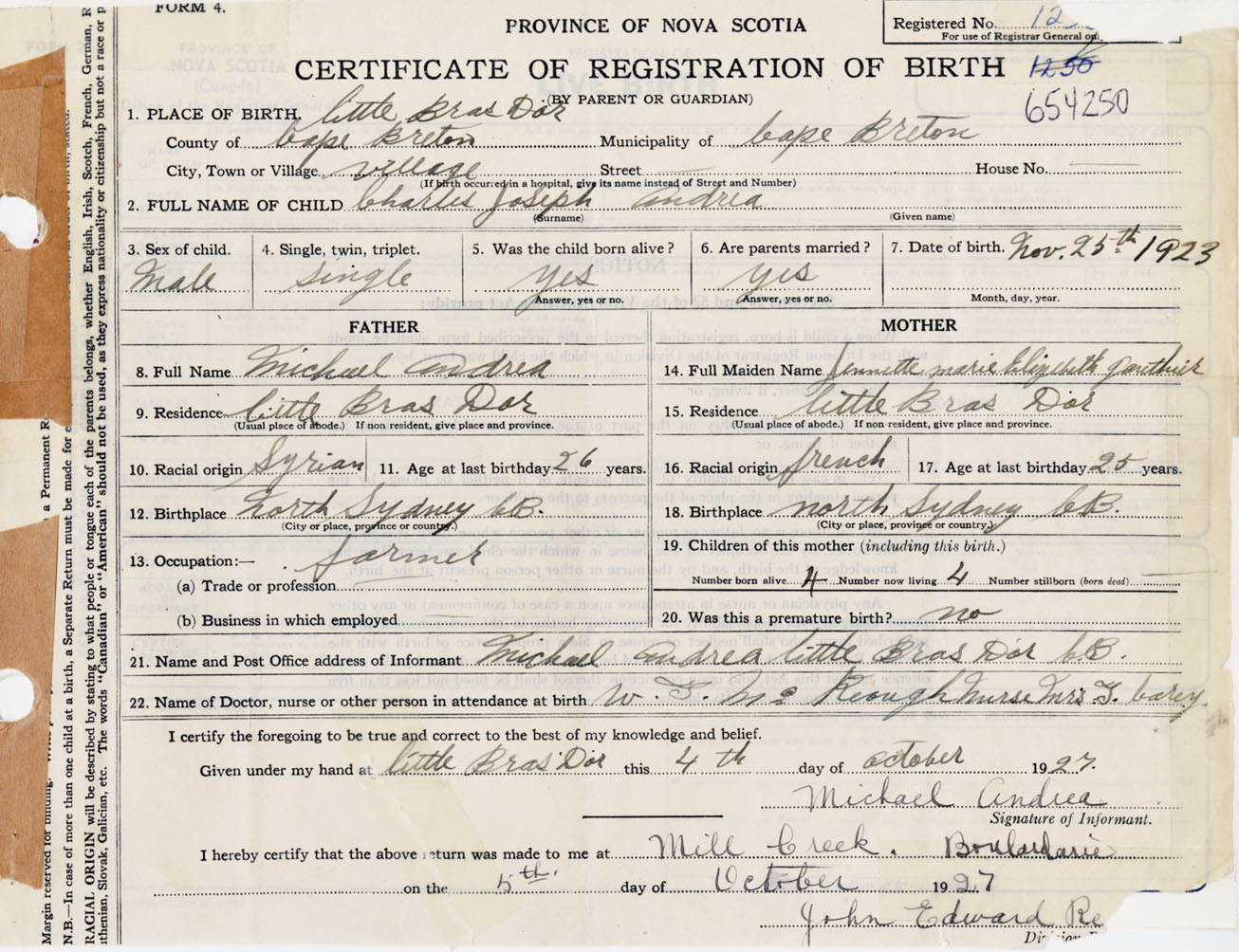 Male Birth Registration: Year: 1923 number: 65400250