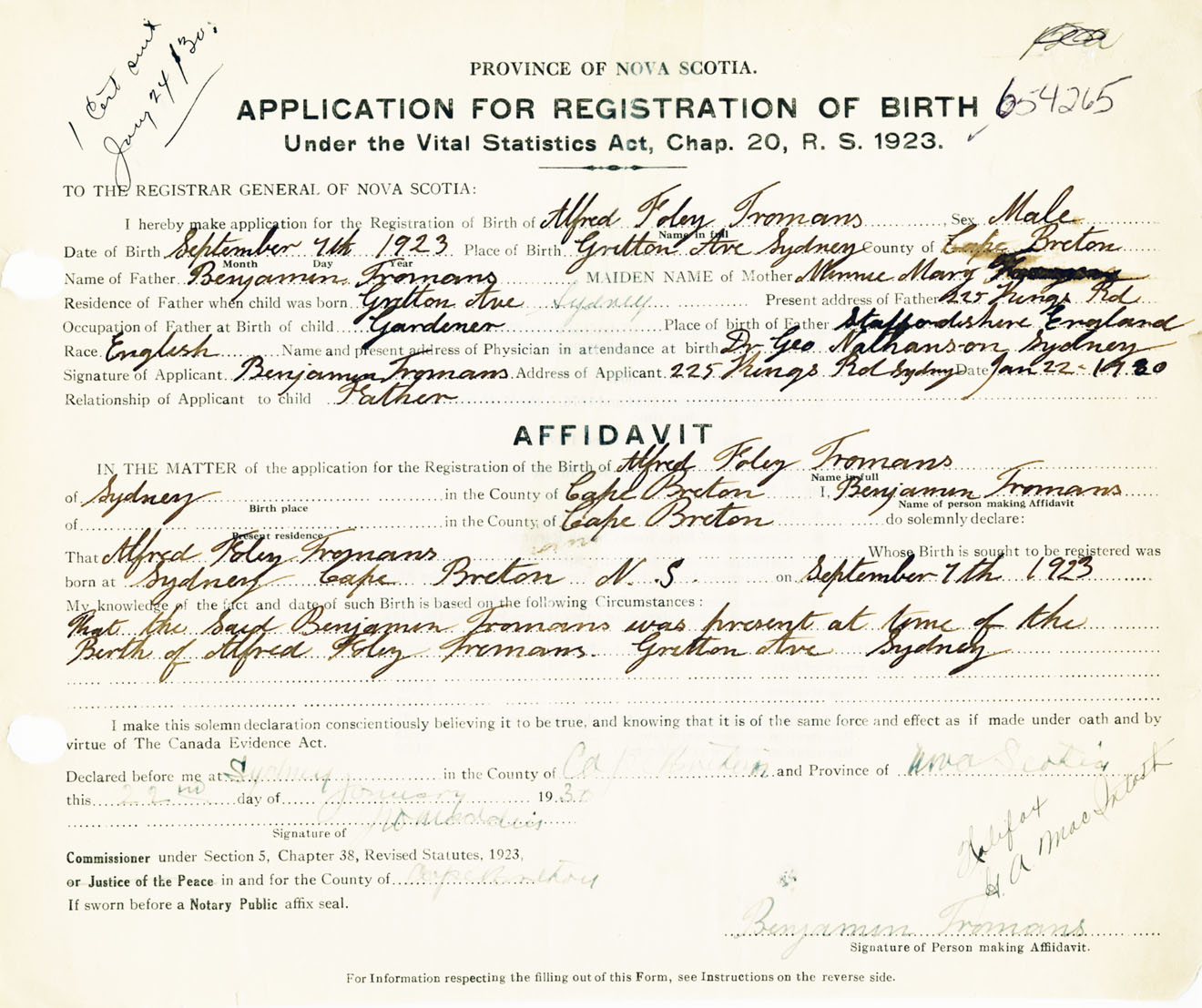 Male Birth Registration: Year: 1923 number: 65400265
