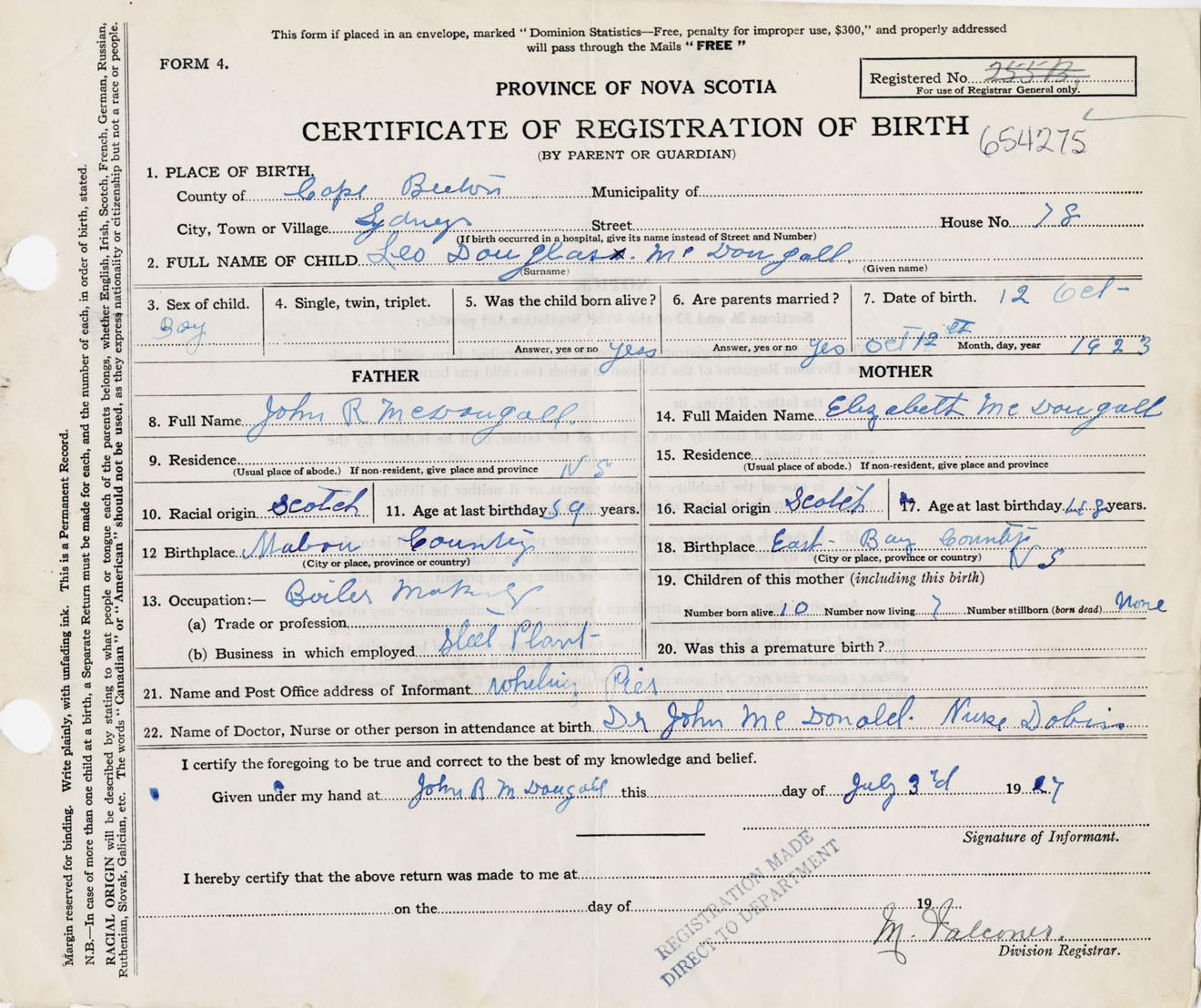Male Birth Registration: Year: 1923 number: 65400275