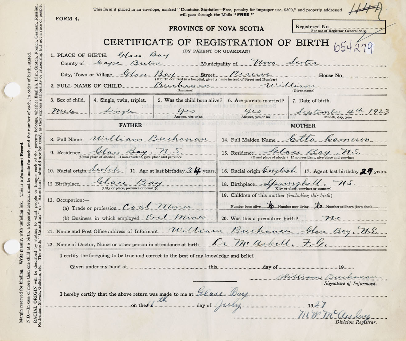 Male Birth Registration: Year: 1923 number: 65400279