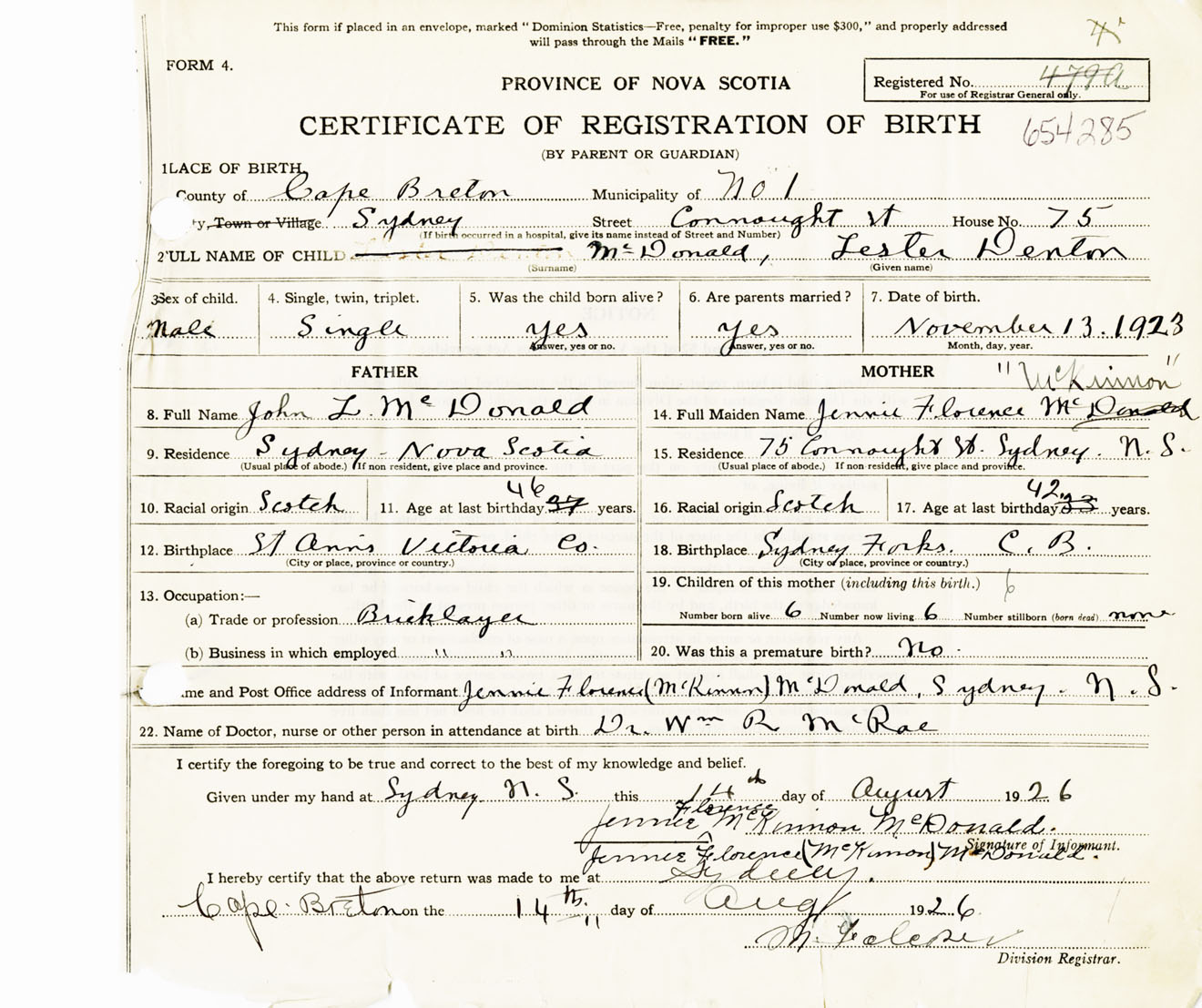 Male Birth Registration: Year: 1923 number: 65400285