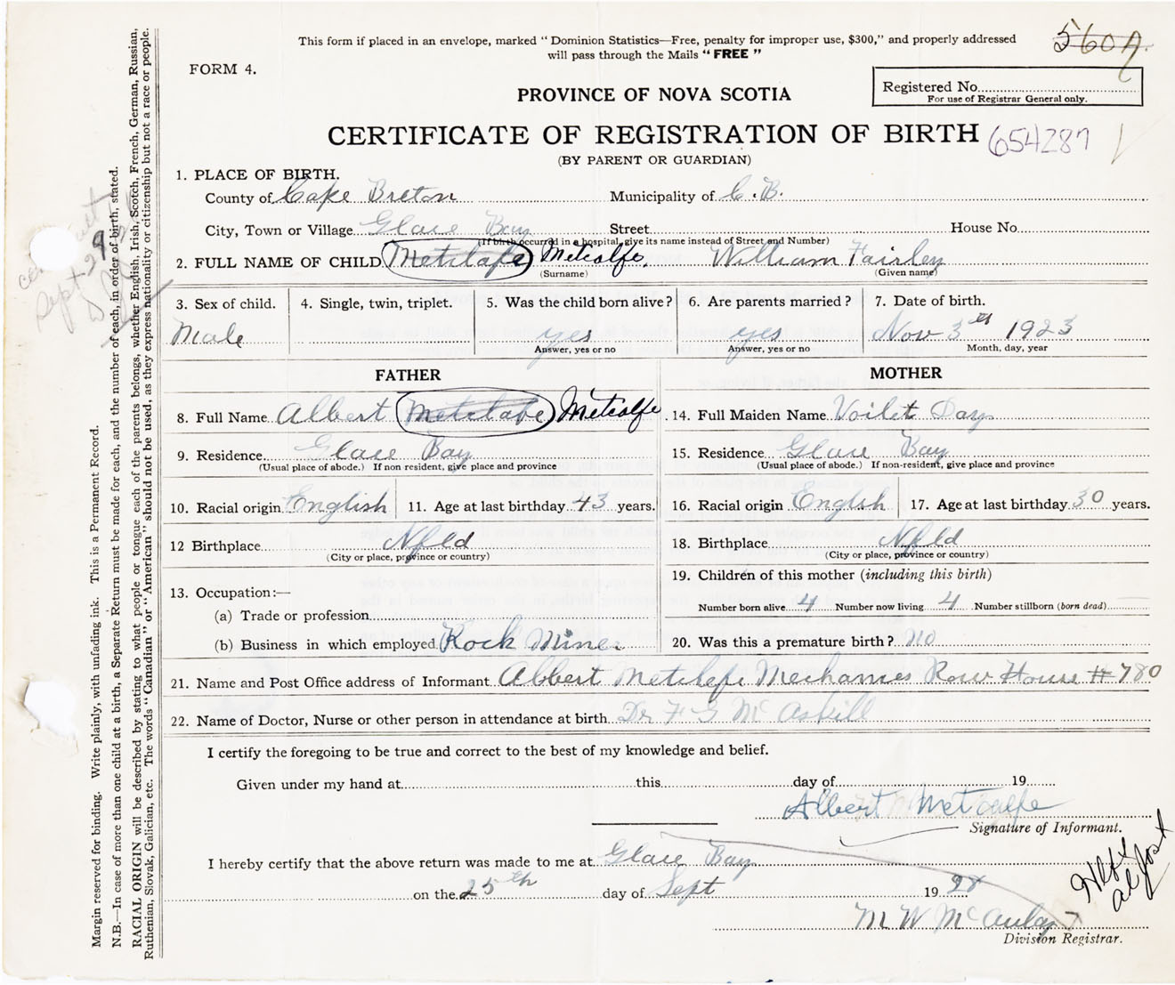 Male Birth Registration: Year: 1923 number: 65400287