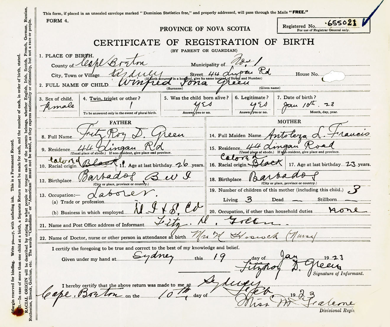 Female Birth Registration: Year: 1923 number: 65500021