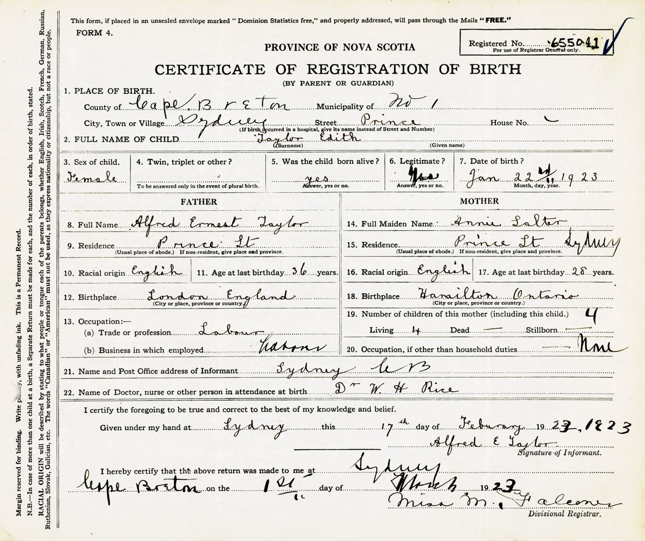 Female Birth Registration: Year: 1923 number: 65500041