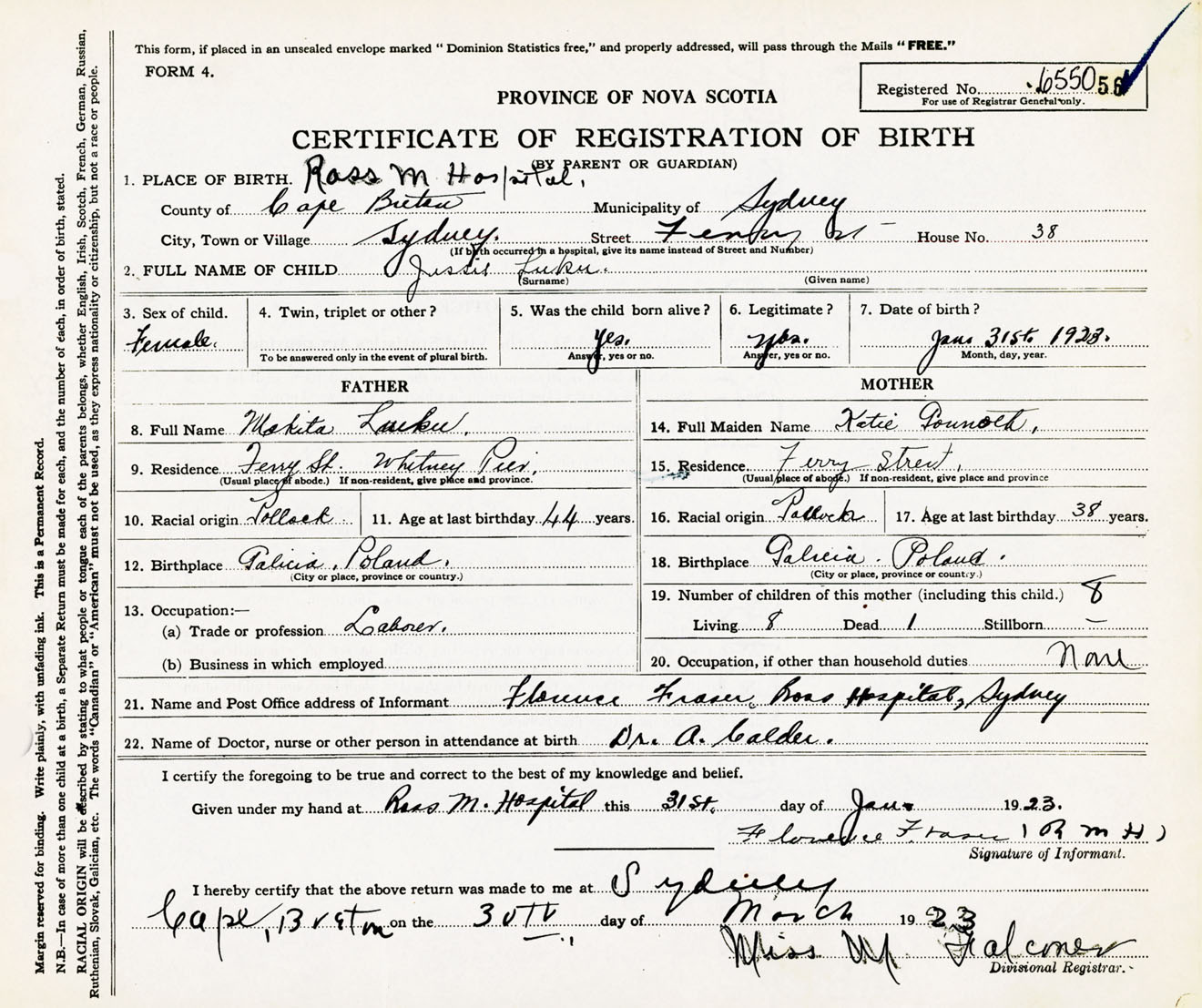 Female Birth Registration: Year: 1923 number: 65500056