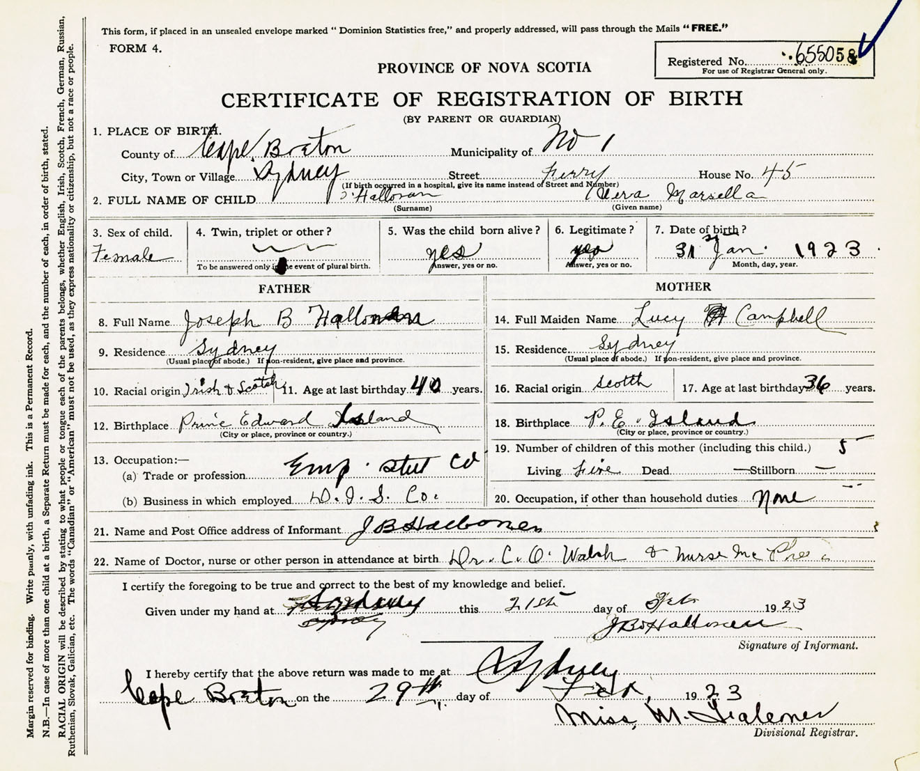 Female Birth Registration: Year: 1923 number: 65500058
