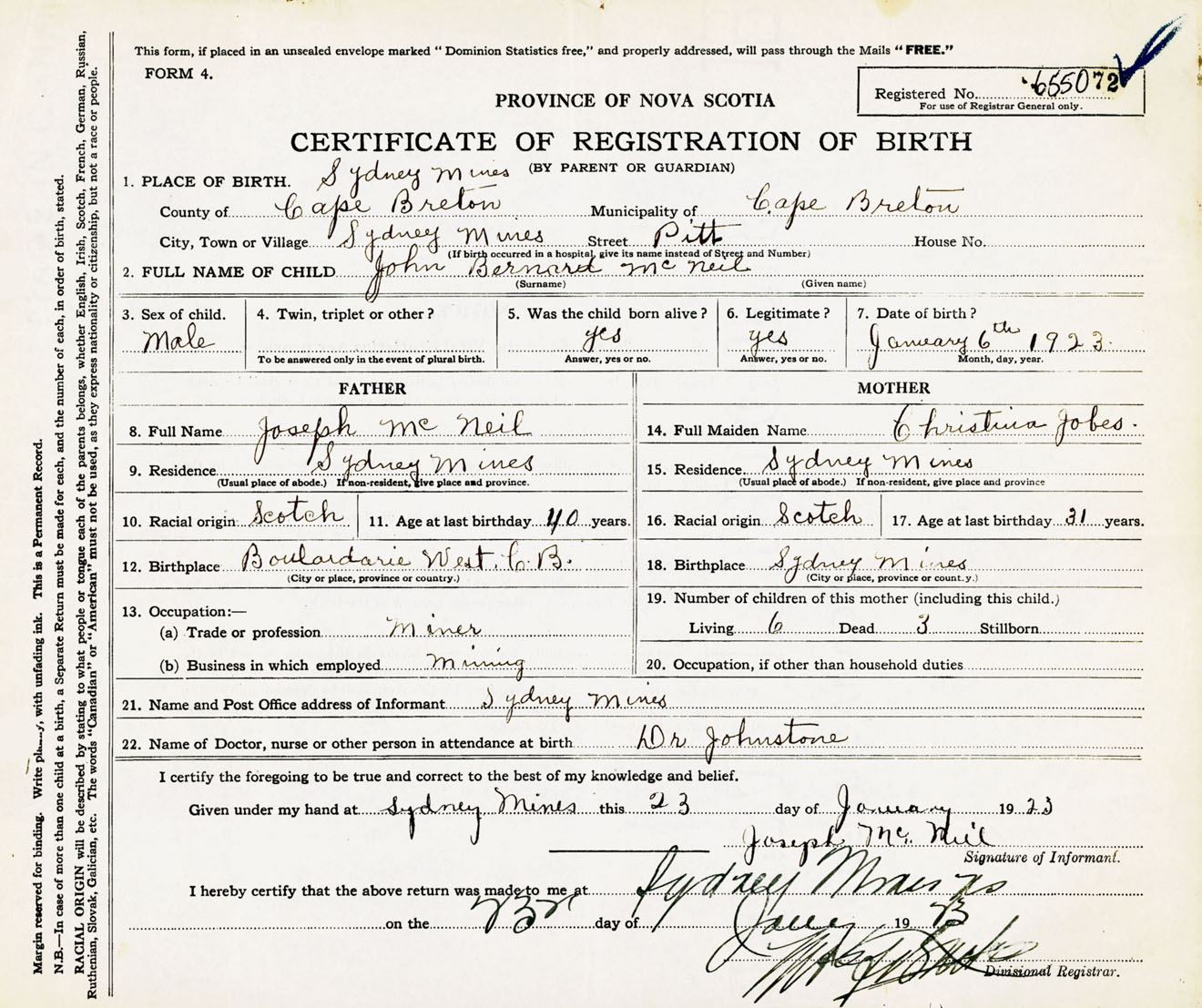 Male Birth Registration: Year: 1923 number: 65500072