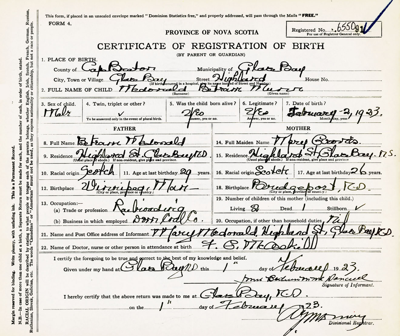 Male Birth Registration: Year: 1923 number: 65500091