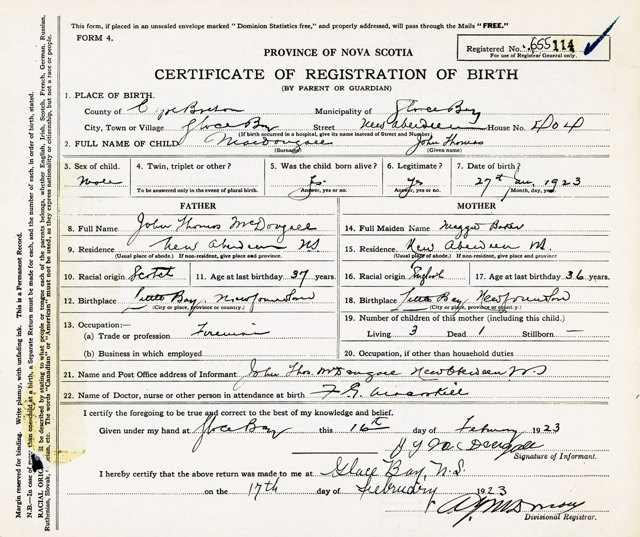 Male Birth Registration: Year: 1923 number: 65500114