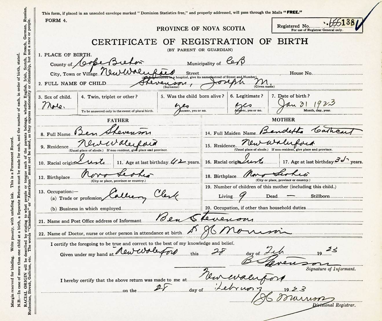Male Birth Registration: Year: 1923 number: 65500138