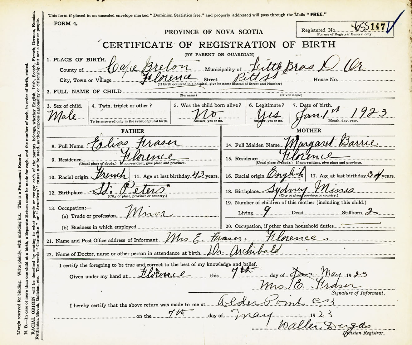 Male Birth Registration: Year: 1923 number: 65500147