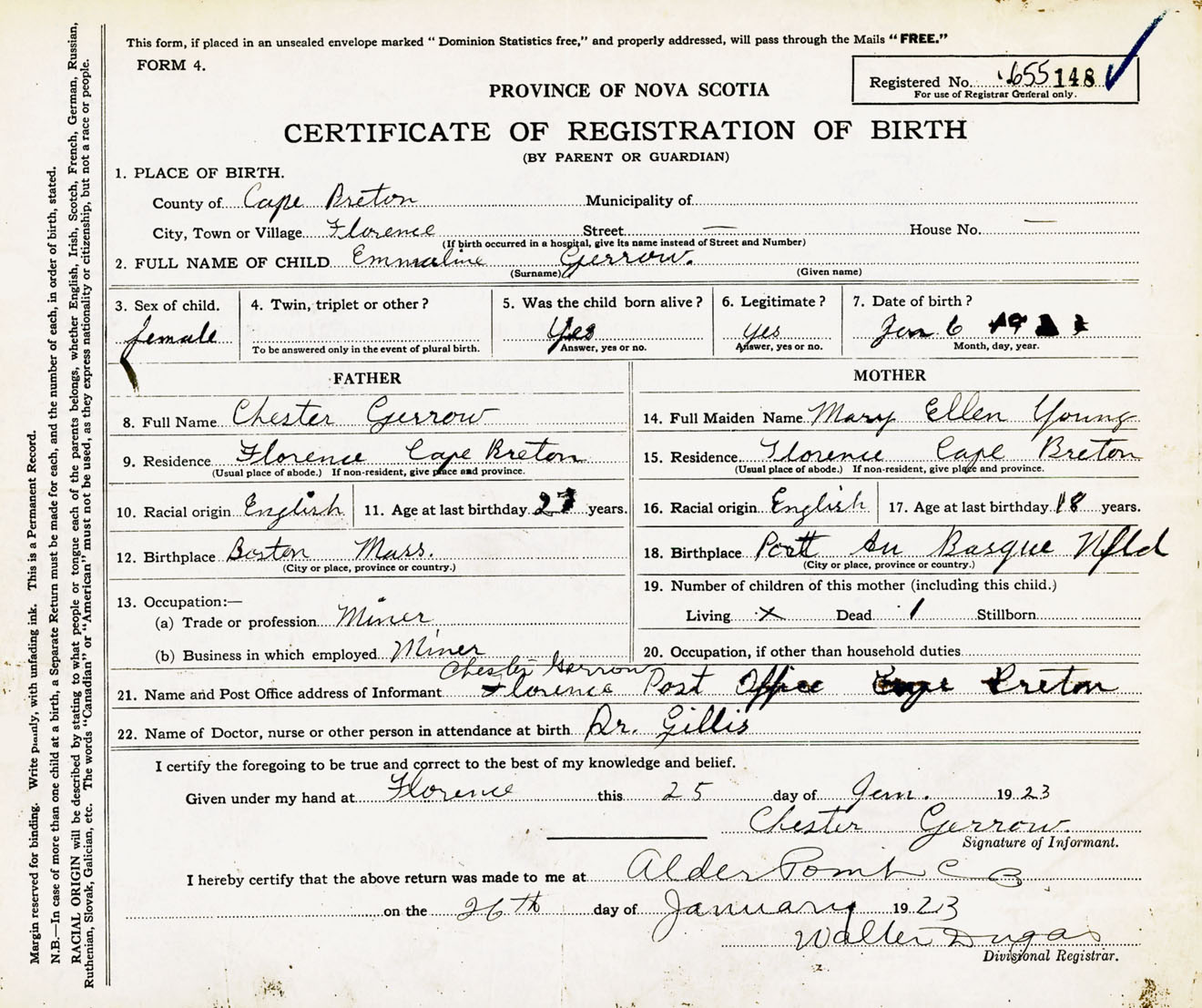 Female Birth Registration: Year: 1923 number: 65500148