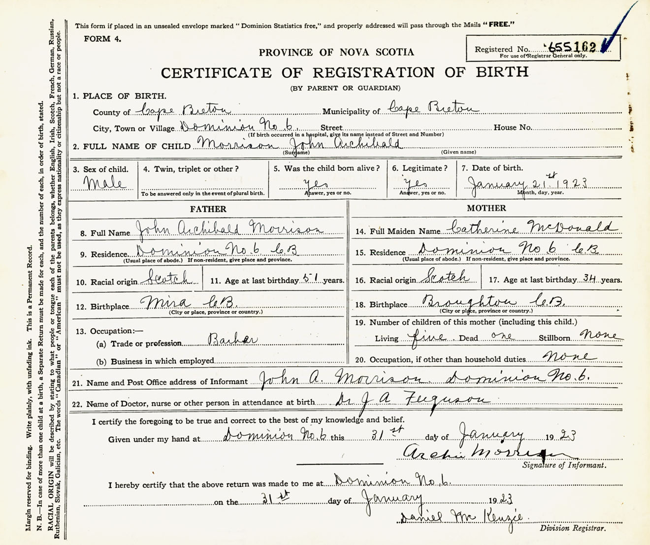 Male Birth Registration: Year: 1923 number: 65500162