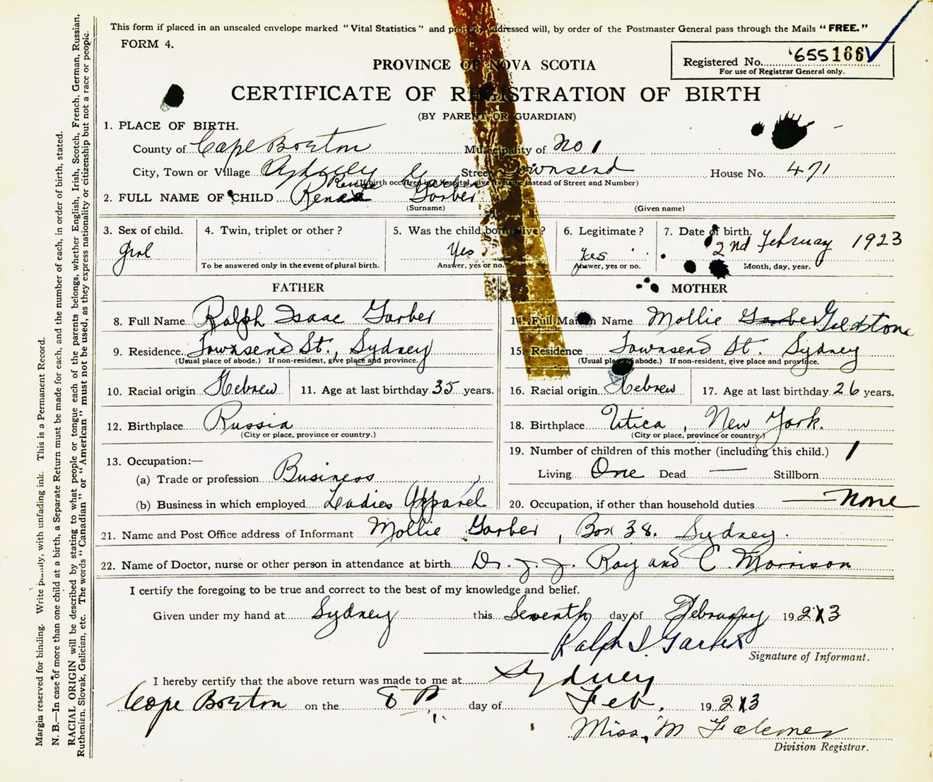 Female Birth Registration: Year: 1923 number: 65500166