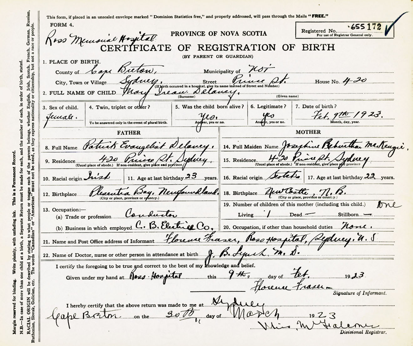 Female Birth Registration: Year: 1923 number: 65500172