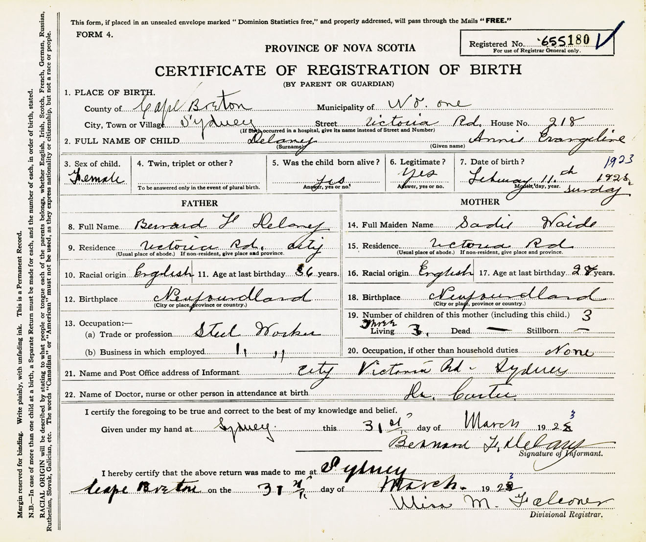 Female Birth Registration: Year: 1923 number: 65500180