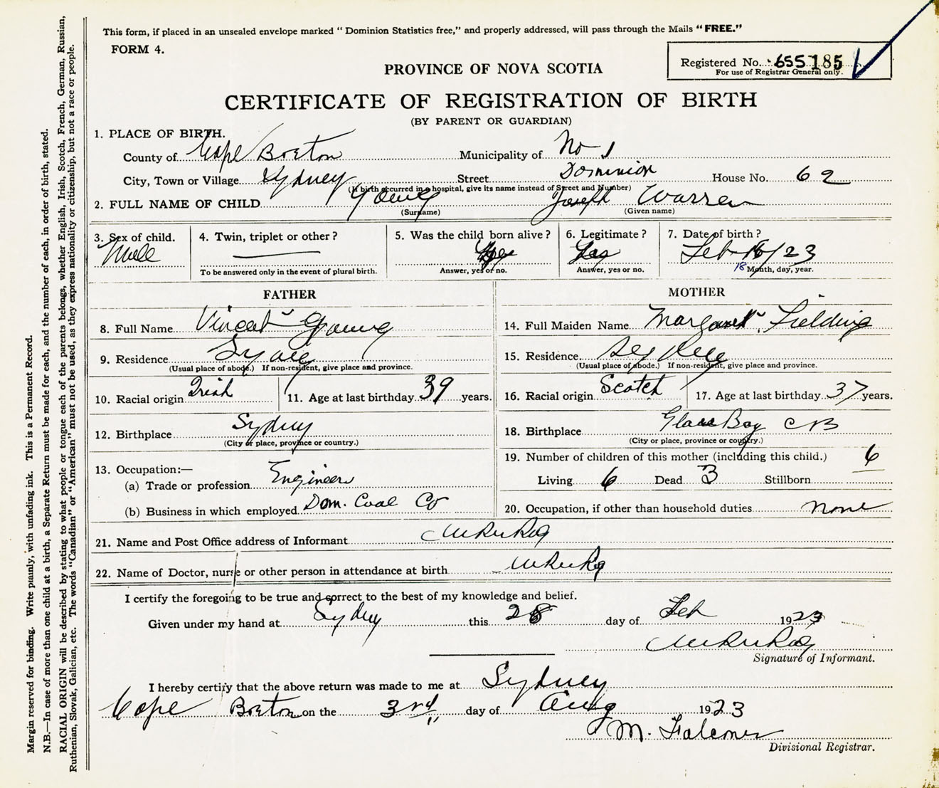 Male Birth Registration: Year: 1923 number: 65500185