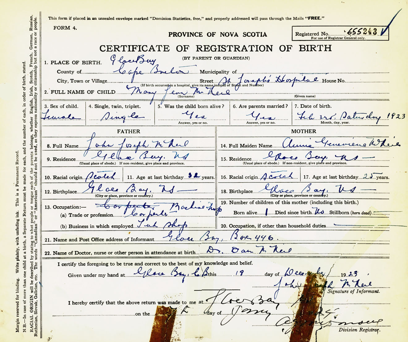 Female Birth Registration: Year: 1923 number: 65500243
