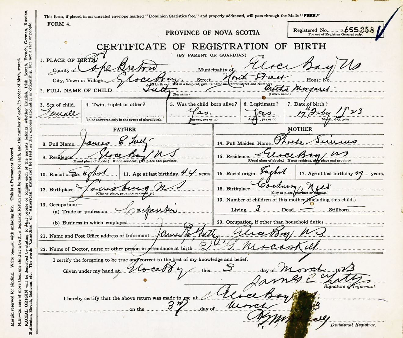 Female Birth Registration: Year: 1923 number: 65500258